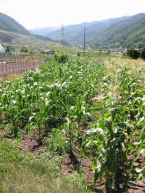 | 5月に植えたとうもろこしの苗その後です。 | 6月に蒔いたとうもろこしの種 その後(左側)です。 |